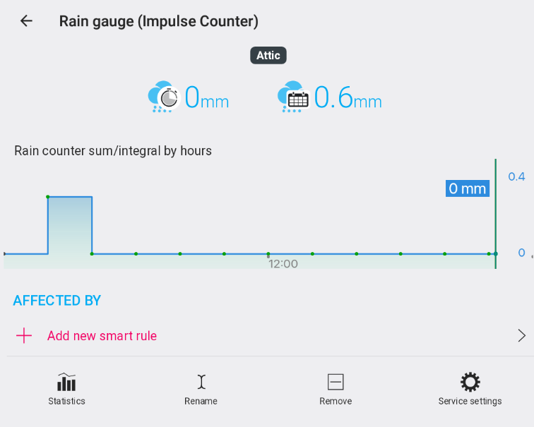 - Prejdite na Nastavenia → Virtuálne zariadenia → Pridať zariadenie a vyberte Zrážkomer (Počítadlo impulzov).