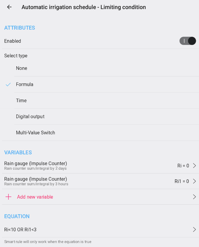 - V týždennom pláne, ktorý riadi automatické zavlažovanie, aktivujte Obmedzujúca podmienka a vyberte Vzorec.